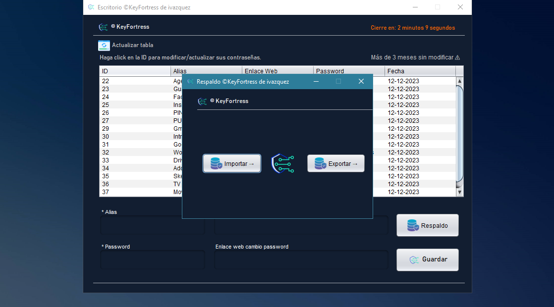 Nunca pierdas tus contraseñas importantes. KeyFortress ofrece una función de copia de seguridad integrada que permite realizar respaldos periódicos de tus datos.